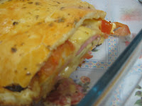 - Abra uma delas e coloque camadas de mussarela, presunto, tomate picado e orégano